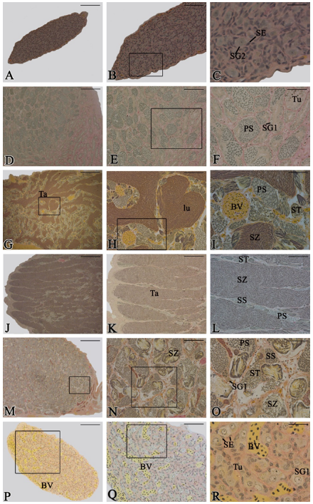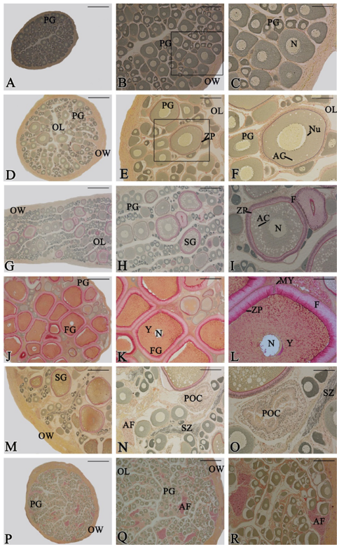 The following were recorded in the evaluation of the reproductive phases of T. galeatus females: immature (Figures 3A-C), early development (Figures 3D-F), late development (Figures 3G-I), spawning capable (Figures 3J-L), regressing (Figures 3M-O), and regenerating (Figures 3P-R) ovaries.