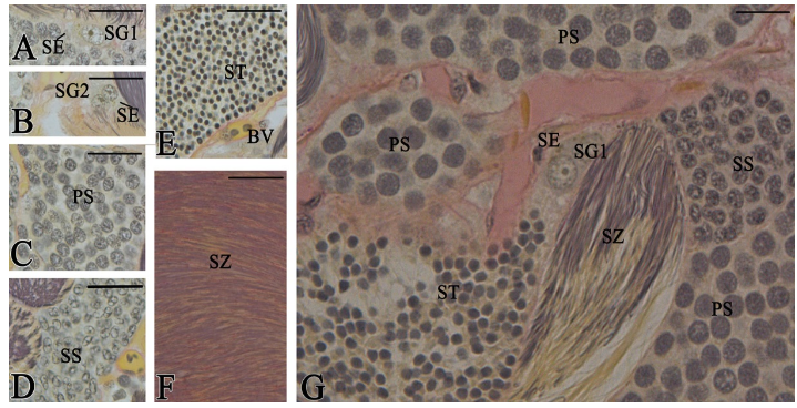 Characterizing the germ cells of the testicles of T. galeatus, the present study found the following: primary spermatogonia (Figures 4A, G), secondary spermatogonia (Figures 4B), primary spermatocytes (Figures 4C, G), secondary spermatocytes (Figures 4D, G), spermatids (Figures 4E, G), and spermatozoa (Figures 4F, G).