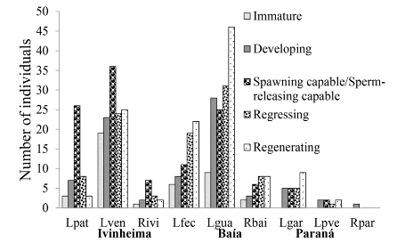 The studies, based on macroscopic analysis of gonads of T. galeatus, evaluated for five annual cycles from October 1986 to September 1988 and from May 1992 to February 1995, recorded individuals reproducing in the Baía, Paraná, Ivinheima and Iguatemi rivers, in the Corutuba and Cortado channels, and in the Patos and Guaraná lagoons, from October to April in the rainy period (Suzuki et al., 2004). The results of the present study show intense reproductive activity for this species in the Garças and Pau Véio lagoons and in the Baía and Ivinheima rivers. The lentic environments in the upper Paraná River floodplain are generally more favorable to the reproduction of this invader.