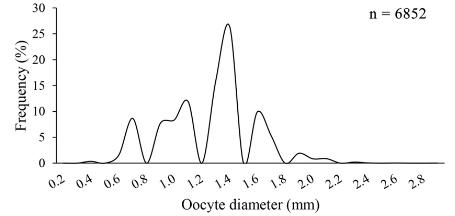 The relative frequency distribution per diameter class of oocytes from T. galeatus ovaries (Figure 8) shows that the diameter of the oocytes varied from 0.4 to 2.9 mm (n = 6852 oocytes; average diameter = 1.3 mm; standard deviation = 0.3) and confirms the hypothesis that this species has synchronous oocyte development, with determinate fecundity and batch spawning over its reproductive period.