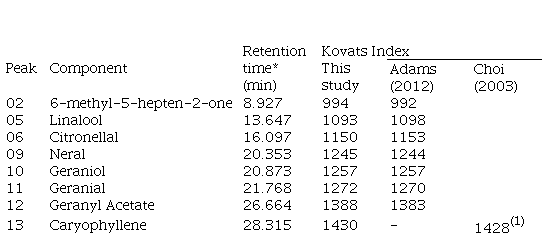Table 1 shows the mean retention time and the Kovats index of the components identified by the chromatogram in Figure 1.