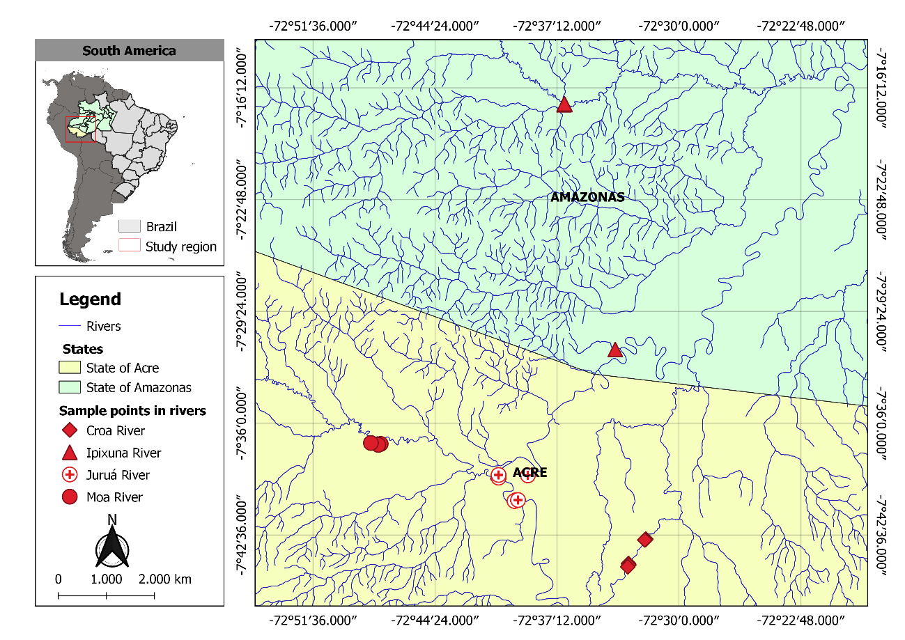 The study was carried out in the municipality of Cruzeiro do Sul, state of Acre, Brazil, at a latitude of 07°37’52’’ S and longitude of 72°40’12’’ W (Figure 1). We selected three sampling sites in the Juruá River (7°40'34.1" S 72°39'39.5" W), located in an urbanized area with a high flow of boats, Crôa River (7°71'48.30" S 72°53'34.98" W), a preserved area dedicated to ecotourism, and the Môa River (7°37'18" S 72°47'47" W), a preserved area highly visited by fishermen.