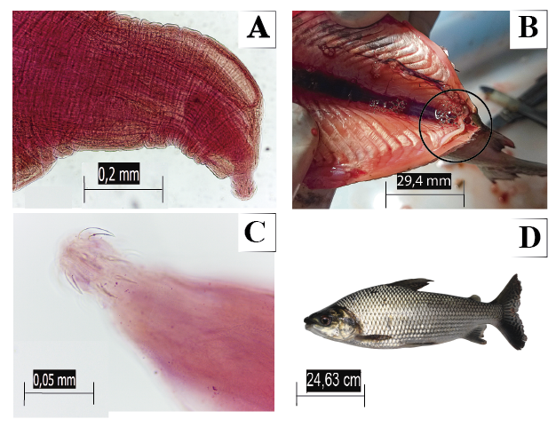 Acanthocephala endoparasites parasitize a wide diversity of terrestrial organisms and aquatic vertebrates (Galaktionov & Atrashkevich, 2015; Saini et al., 2018), in which more than half of the known species are found in wild and farmed fish (Nickol, 2006). These parasites are characterized by the presence of a proboscis with hooks used to pierce and adhere to the host’s intestinal wall (Near, Garey, & Nadler, 1998), and do not have digestive tubes, in this sense they absorb nutrients from their hosts directly from the integument (Valladão, Gallani, Jerônimo, & Seixas, 2020). The life cycle of acanthocephala is indirect and is related to their host’s food chain, including vertebrates as definitive hosts and invertebrates (Insecta, Myriapoda and Crustacea) as intermediate hosts (Martins, Moraes, Fujimoto, Onaka, & Quintana, 2001; Santos, Gibson, Tavares, & Luque, 2008; Belo et al., 2013).