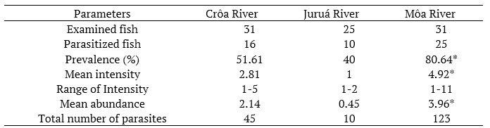 We found a total of 178 specimens of N. curemai, with a total prevalence of (P = 58.62%); the highest parasite intensity was observed in fish from the Môa River (N = 123) and the lowest in the Juruá River (N = 10). There was a significant difference in parasite intensity in P. nigricans collected between the three rivers (Kruskal-Wallis H = 18.8; p < 0.001), in which fish from the Juruá River were significantly different for the others, by showing the lowest intensity of parasitism (Dunn’s p < 0.005). The prevalence, mean intensity, and mean abundance were higher in the Môa River and the lowest in the Juruá River. The intensity of infection ranged from one to 11 parasites per fish, with a higher infestation in specimens from the Môa and Crôa rivers (Table 1).