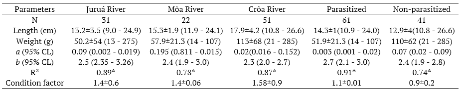 Regarding the length-weight relationship, the b-value did not differ statistically from three for fish species in the three rivers, nor between parasitized and non-parasitized species and the growth was considered isometric (p < 0.05) (Table 2). In the case of the relative condition factor, there was no difference between the sites (ANOVA F = 1.2; p = 0.09) or between the parasitized and non-parasitized specimens (t = 2.31; p = 0.08) in the standard value (K = 1.00).
