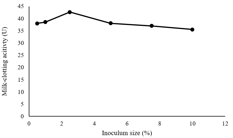 In this study, the influence of inoculum size in the production of milk-clotting enzymes by P. albidus is demonstrated in Figure 1. The edible mushroom produced milk-clotting enzymes using all inoculum sizes tested. The significant result was observed in the inoculum with size of 2.5% (w/w) resulting in milk-clotting activity of 42.60 U and strong coagulation. The inoculum of 30% promoted milk-clotting enzymes production by M. circinelloides cultivated in Indian grain bark (Sathya et al., 2009). The inoculums of 5% and 10% were considered as optimum for proteases production by R. arrhizus-M26 and R. oligosporus-M30, respectively (Irfan, Rauf, Syed, Nadeem, & Baig, 2011). A mutant species of Aspergillus flavus AS2 produced high quantitative of alkaline proteases using an inoculum size of 10% (Rani, Prasad, & Sambasivarao, 2012).