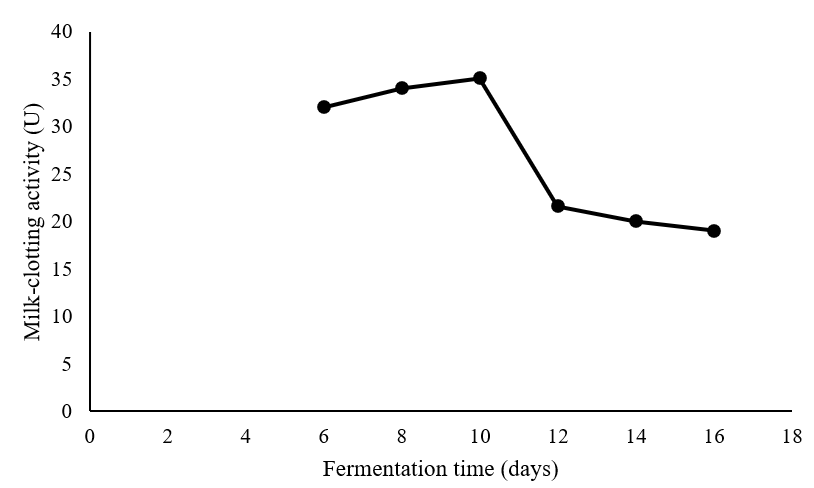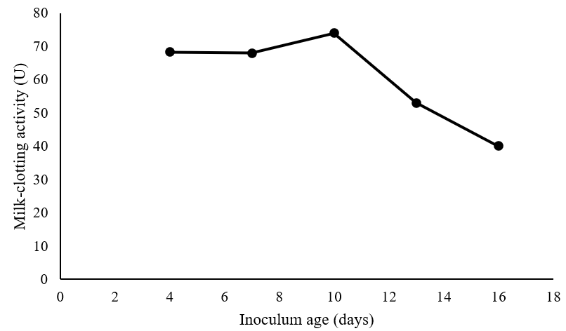 The inoculum age is a biological factor that affects the production of proteases by filamentous fungi. In this research, the highest milk-clotting enzymes production by P. albidus was observed in the 10-day-age inoculum (74.0 U) (Figure 4). Rhizopus arrhizus M-26 produced enzymes at 8-day-age inoculum (Irfan et al., 2011) and A. flavus AS2 and R. oligosporus NCIM 1215 produced enzymes at 4-day-age inoculum (Prasad & Raju, 2013).