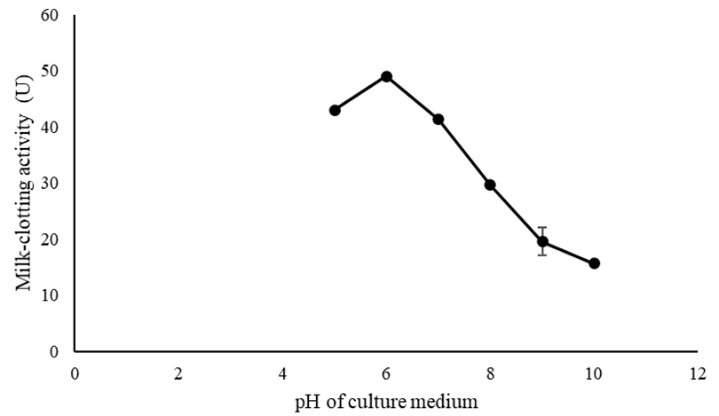 The pH of culture media is another parameter that influences in the production of proteases by different fungi species. In the evaluated conditions, P. albidus produced milk-clotting enzymes with the highest activity at pH 6.0 (49 U) (Figure 3). Rhizopus stolonifer also produced enzymes at this pH range when cultivated in solid matrix (Gais et al., 2009). Bano, Dahot, and Naqvi (2016) showed that P. eryngii produced a high amount of proteases at pH 6.5. Santhi (2014) reported that A. niger MTCC 281 produced a significant amount of protease when grown in Punica granatum residue, pH 5.0. Bensmail et al. (2015) cited that variations of pH during the bioprocess have interfered in the growth of microrganisms and also in the enzyme production. This occurs due to the modification in the catalytic process and in the transport of nutrients through cell membrane.