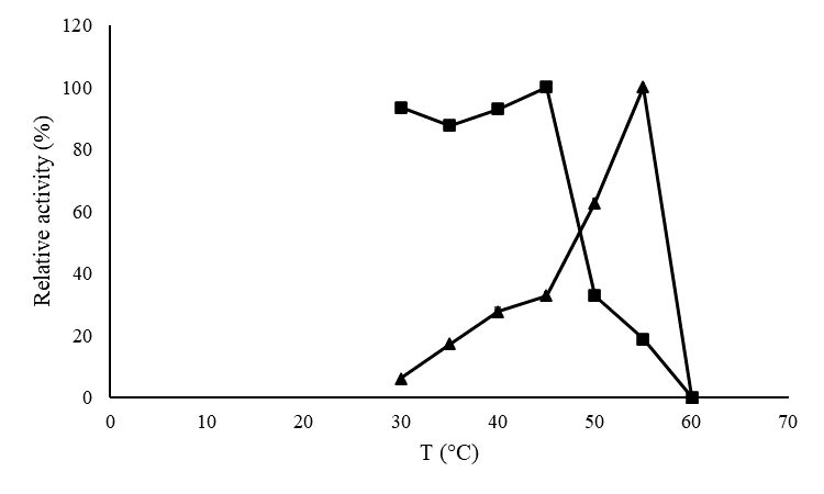 Optimum temperature was determined by incubating the enzyme extract at different temperatures ranging from 30 ºC to 80 ºC and assaying the activity at the pH determined as optimum. In thermal stability, the extracts were incubated at different temperatures ranging from 30 to 80°C 1 hour. The solution of 10% (w/v) skimmed milk powder in 0.05 M CaCl2 was used as substrate. All samples were prepared in triplicate. Relative enzyme activities were determined according to the optimal conditions of pH and temperature (Martim et al., 2017).