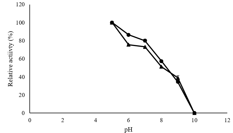 According to Oueslati & Mounirhaouala (2014) and Ahmed, Wehaidy, Ibrahim, El Ghani, & El-Hofi (2016) it is known that pH modifications can change the electric charge of amino acids in the enzymatic active site or change the secondary and tertiary structures of enzymes. These modifications affect the link of substrate and enzyme which result in loss of catalytic activity.