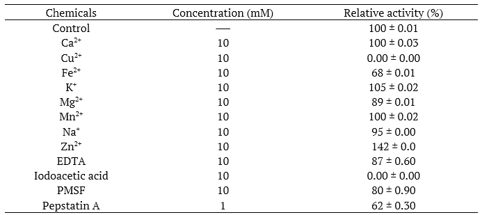 The effect of inhibitors and metal ions on enzyme activity was investigated by using 10 mM of phenylmethylsulfonyl fluoride (PMSF), ethylenediaminetetraacetic acid (EDTA), pepstatin A (0.1mM), iodoacetic acid, CaCl2, CuSO4, KCl, FeSO4, MgSO4, MnSO4, NaCl and ZnSO4. Samples were incubated at 37 ºC for 60 minutes and residual enzyme activities were determined and compared to the control, which was incubated without the inhibitors and metal ions and corresponds to 100% of activity. All samples were prepared in triplicate (Martim et al., 2017).