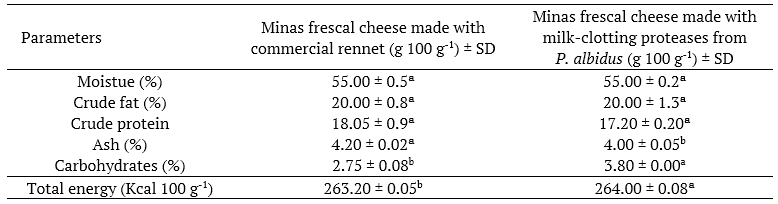 Ricardo, Katsuda, Maia, Abrantes & Oshiro (2011) reported moisture contents of 68.96% to 34.66% in Minas frescal cheese marketed in the city of Londrina. Magenis et al. (2014) reported values of humidity (55.05%), lipids (22.27%) and proteins (16.79%) for commercial samples of Minas frescal cheese. Piazzon-Gomes, Prudêncio, & Silva (2010) found that Minas frescal cheeses made with commercial coagulant had the following proximate composition: moisture (59.57%), proteins (14.98%), lipids (18.10%), ashes (2.79%) and carbohydrates (4.57%). Oliveira, Silva, & Pascoal (2014) reported that the average energy value of Minas frescal cheese is 218.4 (Kcal 100g-1), which is lower than that reported for the same product made with milk-clotting proteases from P. albidus.