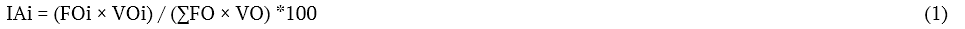 Diets were characterized using the Feeding Index (IAi), expressed as a percentage in order to calculate the relative importance of each item found in the stomach contents. This index consists of the ratio between the product of the frequency of occurrence and volume, measured using a millimeter Petri dish covered on the outside with 1x1 graph paper (Albrecht & Caramaschi, 2003) for each item divided by the sum of products for all items found (Kawakami & Vazzoler, 1980), Equation 1: