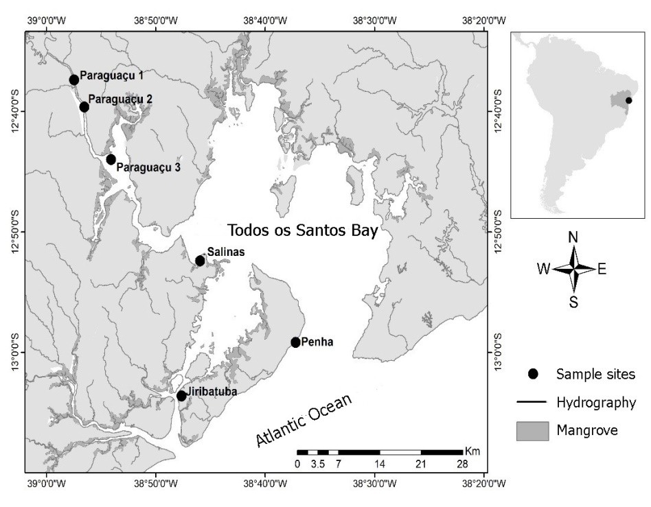 The study was conducted in the Todos os Santos Bay (TSB), located at 12°50’05” S, 38°46’20” W (Figure 1). The bay is the second-largest in Brazil, with an area of approximately 1,100 km2 (Cirano & Lessa, 2007; Couto, Guimarães, & Oliveira, 2013; Vale & Schaeffer-Novelli, 2018). TSB is home to extensive stretches of coral reefs, estuaries, and mangroves. Most of these ecosystems are associated with the region’s freshwater tributaries (Hatje & Andrade, 2009; Lessa, Cirano, & Genz, 2009). TSB has a wet climate with an average of 53% of the total annual rainfall occurring between April and July (Lessa et al., 2018).