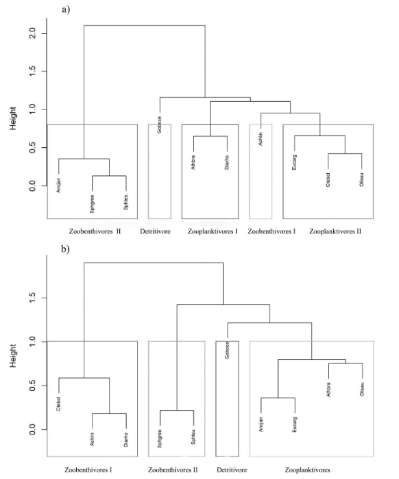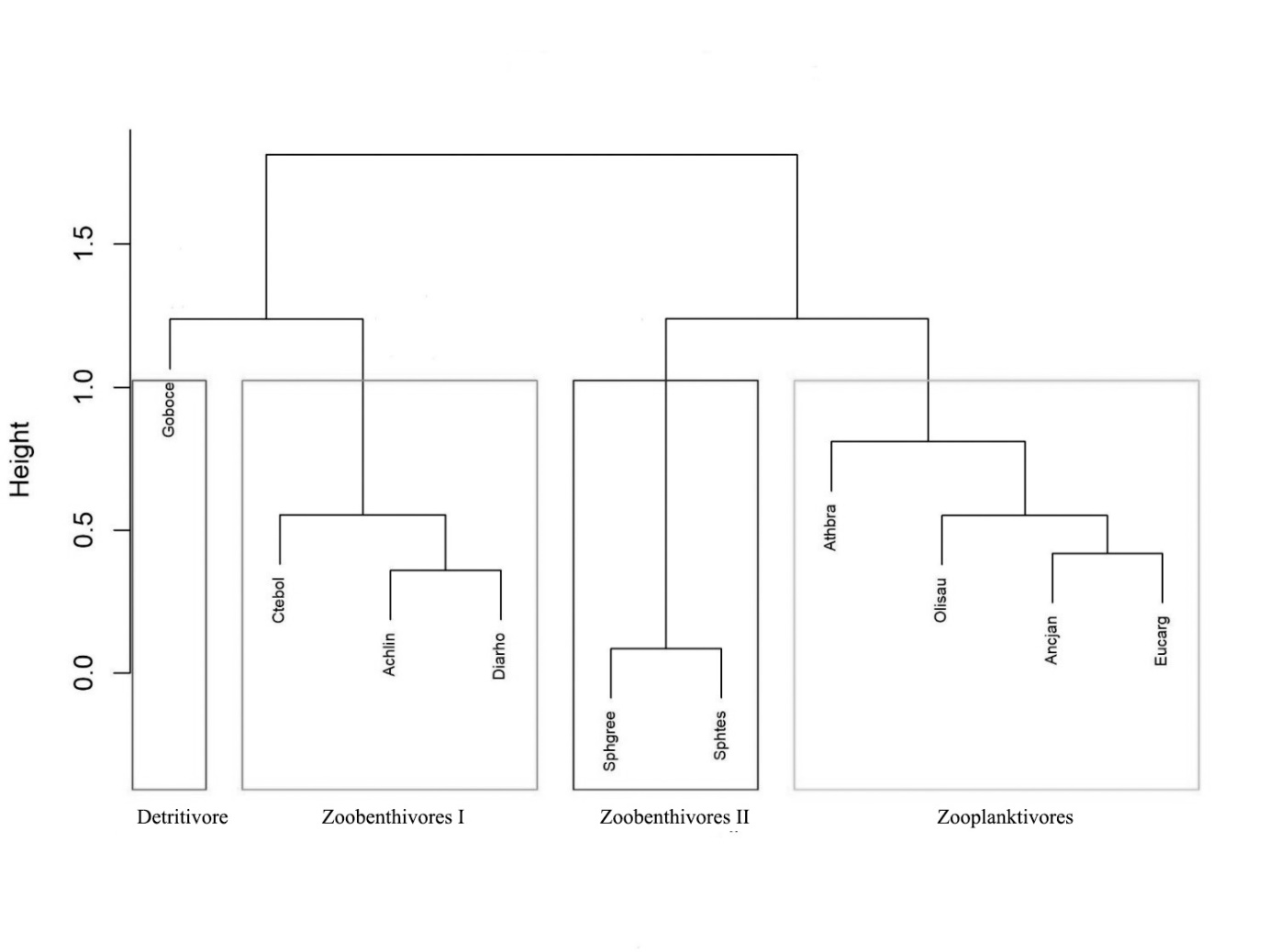 The dendrogram generated from the cluster analysis identified four trophic guilds: detritivore, zoobenthivores I, zoobenthivores II, and zooplanktivores (Figure 2).