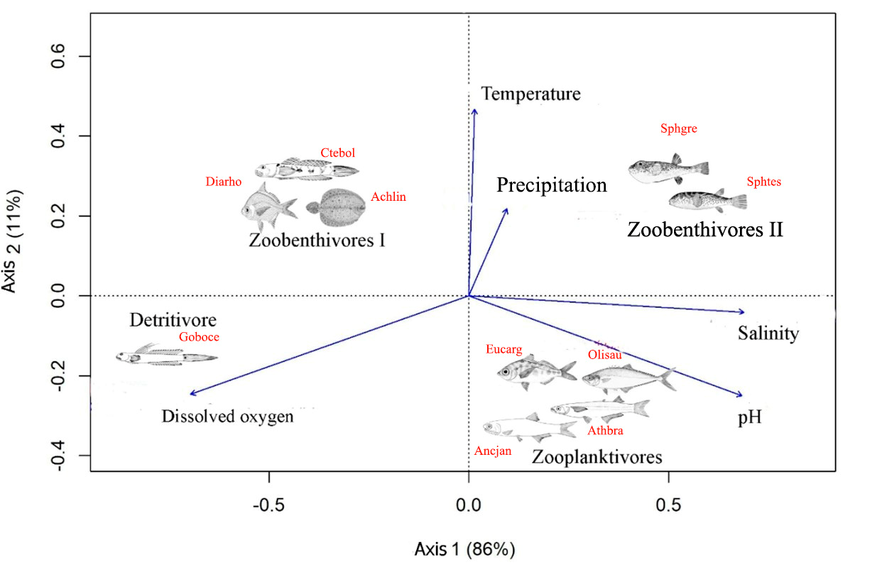 The canonical correspondence analysis showed the relationship between the abundance of the species in each trophic guilds and environmental parameters. The analysis indicated that the zoobenthivores II and zooplanktivores guilds had a positive relationship with the salinity and pH vectors on the first axis, which accounted for 86% of the variation in the data, and were inversely related with dissolved oxygen (Figure 4), though only the correlation with salinity was significant (p < 0.05) The temperature and precipitation were the main variables on the second axis, accounting for 11% of the variability.