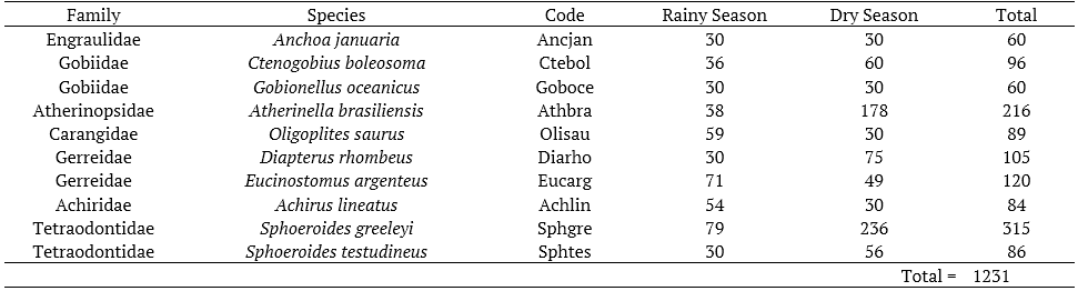 By combining abundance and occurrence data, all species collected were initially classified as abundant, frequent, and rare, according to Garcia & Vieira (2001). This procedure was used to identify the 10 dominant species in the study area (i.e., species with high abundance and frequency), representing 70% of the total collected individuals. These species were thus chosen for further analysis in this study. Although all species play some role in the trophic context, the dominant species reflect the most common patterns and conditions in the environment (Magurran, Khachopisitsak, & Amhad, 2011). The diet analysis was carried out on each dominant species with a minimum of 30 individuals collected per period (dry and wet season). The food items found in the fish stomachs were analyzed under a stereoscopic and optical microscope (when necessary) and identified to the lowest taxonomic resolution, depending on the degree of digestion of each item. The following references were consulted to identify food items: Costa et al. (2006), Brusca & Brusca (2007), Barnes, Calow, & Golding (2008), and Fransozo & Negreiros-Fransozo (2016).