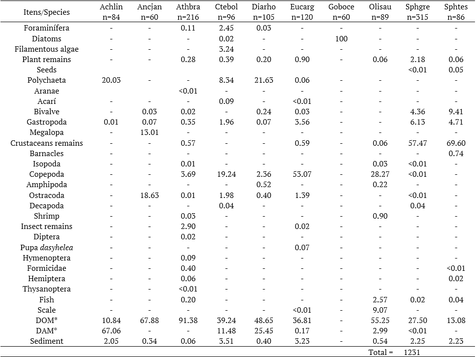 In general, a high amount of digested organic matter was found in the diet of most species. Most items comprised organisms associated with the hyperbenthic zone (e.g., Polychaeta, Mollusca, and diatoms) and, to a lesser extent, zooplankton (e.g., Copepoda and Amphipoda). Additionally, allochthonous food items (e.g., insects) were particularly abundant in the diet of A. brasiliensis.