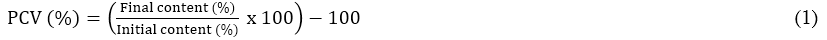 The energy value was calculated using the Atwater coefficients that consider 4 kcal g-1 of sample for proteins and carbohydrates and 9 kcal g-1 of sample for lipids (Merril & Watt, 1973). The proximate composition variation of the cultivated media for proteins, lipids and fibers was calculated by the percentage difference between the concentration presented in the cultivated medium (greater accumulation) and treated medium (inoculated) (Equation 1), according to Fonseca et al. (2009).