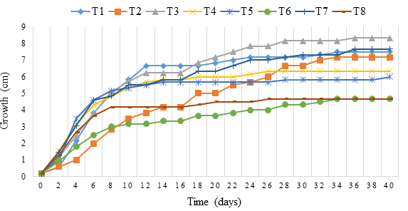 Ammonium nitrate was the nitrogen source that showed the greatest growth in the two substrates (T3: 8.33 cm and T7: 7.67 cm) compared to the other treatments (4.67 to 7.17 cm), especially for the green bocaiuva pulp. In relation to the control treatments, it can be observed that the substrate with green bocaiuva pulp and water showed the greatest growth (7.50 cm), which was close to that observed for the treatment with ammonium nitrate and a mixture of green bocaiuva pulp and wheat bran (T7: 7.67 cm). There was no significant difference (p < 0.05) in relation to all treatments after 30 and 40 days of cultivation.