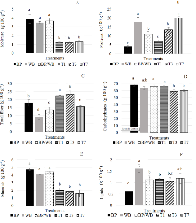The results obtained for the proximate composition of wheat bran, dehydrated green bocaiuva pulp and the three best treatments with dry mycelial growth are shown in Figure 2. It is observed that the wheat bran, the green bocaiuva pulp and the treatments presented moistures of 1.22 ± 0.17 to 3.88 ± 0.49 g 100 g-1 (Figure 1A). According to the Brazilian legislation it should not exceed 15 g 100 g-1 (Agência Nacional de Vigilância Sanitária [Anvisa], 2005a).