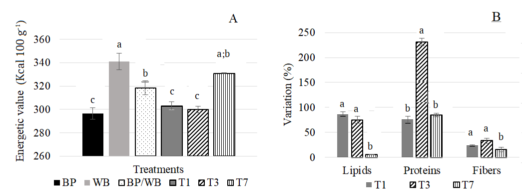 It can be observed that the treatments with green bocaiuva pulp (T1 and T3) had lower energy value in relation to the experiment with the mixture of bocaiuva pulp and wheat bran (T7) (Figure 3A). This behavior may be related to the increase in the protein content, indicating that the microorganism efficiently utilized the source of exogenous nitrogen to the bioconversion of carbohydrates and some fibers into protein.