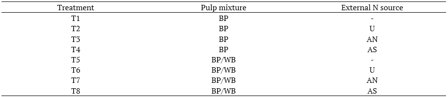 The experiments were carried out with 2 pulp combinations: dehydrated green bocaiuva pulp (BP) or dehydrated green bocaiuva pulp plus wheat bran (BPWB) in a 1: 1 w w-1 proportion. For each combination of pulps, experiments were carried out without the addition of a nitrogen source, but only distilled water, or with the addition of 2% external nitrogen sources: urea (U), ammonium nitrate (AN), and ammonium sulfate (AS), resulting in eight treatments (Table 1). Each treatment was placed into 50 mL test tubes, sterilized in an autoclave at 121ºC for 20 min. and inoculated with 5 cm discs of myceliated agar. The tubes were incubated at 30ºC and the axemic growth of the fungus was measured every 2 days with a calibrated ruler (Ilyas & Avin, 2018).
