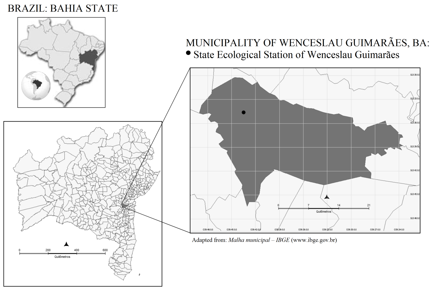 The State Ecological Station of Wenceslau Guimarães. (SESWG) (13°35’43’’S and 39°43’10’’W) located in the municipality of Wenceslau Guimarães, Bahia is a priority area for conservation in the full protection category (SNUC Law 9985/2000 and Decree 4340/2002). Currently, it comprises a total area of 2,418 ha of protected forests. It was created by the State Decree 6228/1997 and later expanded by the Decree 7791/2000. It is inserted in the Atlantic Forest biome, and it is composed exclusively of the Submontane Ombrophilous Dense Forest phytophysiognomy (Figure 1) (Rigueira et al., 2012).