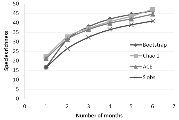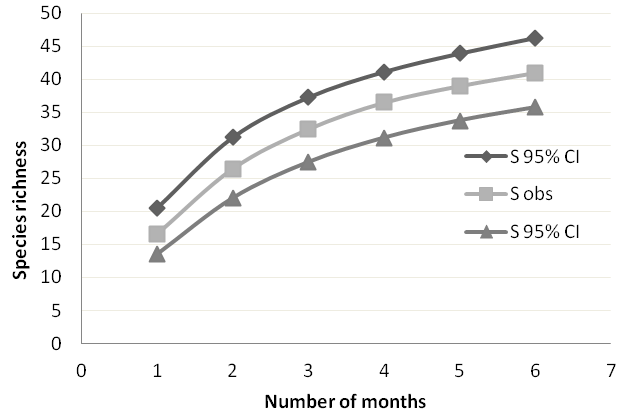 The sampling efficiency obtained with the estimators Chao1= 87%, ACE= 92.1% and Bootstrap= 88.7% was higher than 80%. Notwithstanding, the accumulated number of species collected demonstrates the need for further sampling, including seasonality studies in order to better approach the curve asymptote.