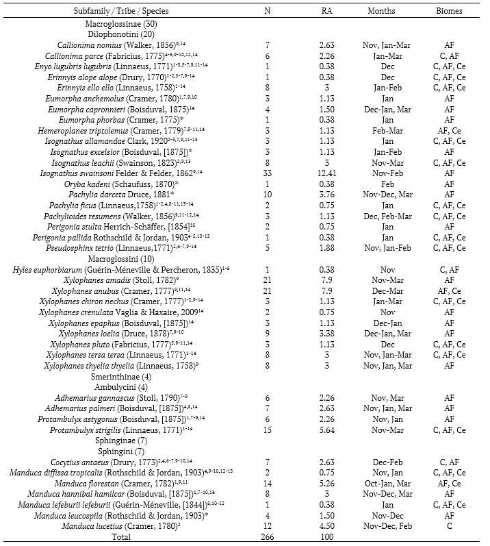 Sphingidae nomenclature and classification followed Carcasson and Heppner (1996), Camargo et al. (2018) and Haxaire and Mielke (2019). The species were identified based on information and illustrations obtained in Martin, Soares, and Bizarro (2011), Camargo et al. (2018) and through consultation to the insect Embrapa Cerrados entomological collection, Planaltina, Distrito Federal.