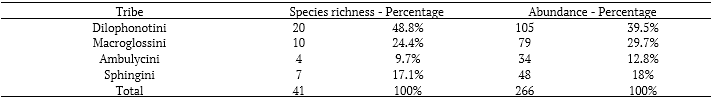 The hawkmoth assemblage consists of the three subfamilies: Macroglossinae, Smerinthinae and Sphinginae. Macroglossinae was represented by two tribes: Dilophonotini, distributed across 20 species of 11 genera, represented 39.5% of the individuals collected (N = 105), and Macroglossini with 10 species of two genera accounted for 29.7% of the individuals collected (N = 79). Smerinthinae was represented by the only tribe that occurs in the Neotropical region, Ambulycini, with four species of two genera that represented 12.8% of the individuals collected (N = 34). Sphinginae was represented by the tribe Sphingini with seven species of two genera, which amounted to 18% of the individuals collected (N = 48) (Table 2).
