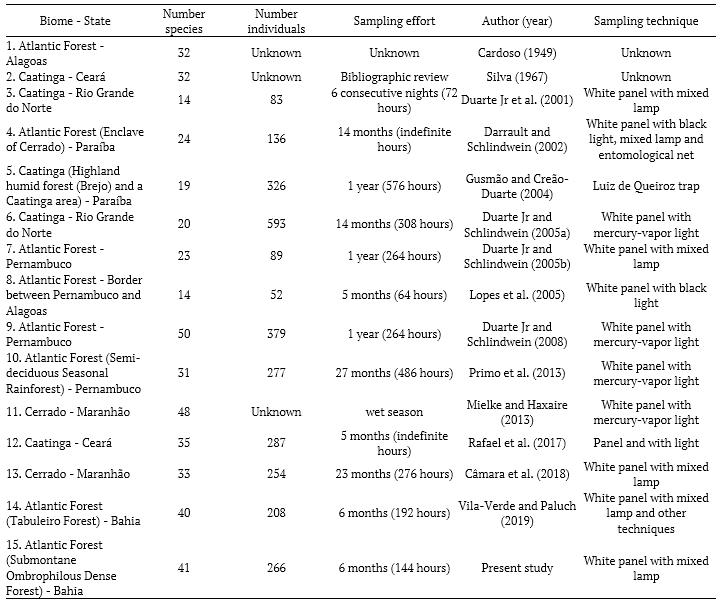 In northeastern Brazil, the hawkmoths are known chiefly by species inventories, distributed in the biomes Caatinga, Atlantic Forest and Cerrado (Cardoso, 1949; Silva, 1967; Duarte Jr, Motta, & Varela-Freire, 2001; Darrault & Schlindwein, 2002; Gusmão & Creão-Duarte, 2004; Duarte Jr & Schlindwein, 2005a, 2005b, 2008; Lopes, Medeiros, Aguiar-Neto, & Machado, 2005; Primo, Duarte, & Machado, 2013; Mielke & Haxaire, 2013; Rafael et al., 2017; Câmara, Rocha, & Pereira, 2018; Vila-Verde & Paluch, 2019).