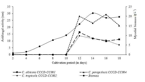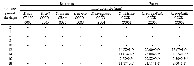However, there was antifungal activity which appears to be favorable for all samples from the 12th day of culture onwards. This activity presented greater IH against C. albicans CCCD-CC001 and C. tropicalis CCCD-CC002 in 12 days and against C. parapsilosis CCCD-CC004 after 16 days of cultivation (Figure 1).