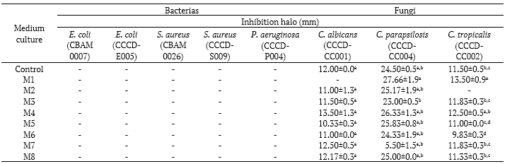 However, antifungal assays revealed more promising data (Table 1), since, with the exception of the sample M1 against C. albicans CCCD-CC001 and the sample M2 against C. tropicalis CCCD-CC002, the others were able to form inhibition halos against all the evaluated yeasts. Of these, we can highlight: C. albicans CCCD-CC001 from samples M4, M7 and M8, without statistical difference between them, with an IH of 13.5, 12.5 and 12.17 mm respectively; C. tropicalis CCCD-CC002, in samples M1, M4 and M7, presented an IH greater than 11 mm; and finally, samples M1 (27.67 mm), M4 (26.33 mm) and M5 (25.83 mm) against C. parapsilosis CCCD-CC004, the latter being the most sensitive yeast in the samples tested.