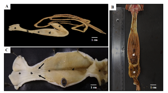 Anatomically, the esophagus and stomach of the A. gigas are tubular organs composed of muscle fibers that connect the pharyngeal cavity to the proximal intestine (Figure 1A). The esophagus is presented in form of a muscular and short rectilinear tube (Figure 1A and C), but at the pharyngo-esophageal junction (cranial portion), a marked dilution of the fan-shaped organ (a) is observed, and in the caudal portion a visible reduction of the lumen (b). On the other hand, the stomach is a J-shaped muscle sac (Figure 1A), located on the left side of the cavity, extending from the esophagus to the proximal intestinal portion. The esophageal mucosa is characterized by numerous longitudinal folds, most evident in the medial and caudal region (Figure 1C).