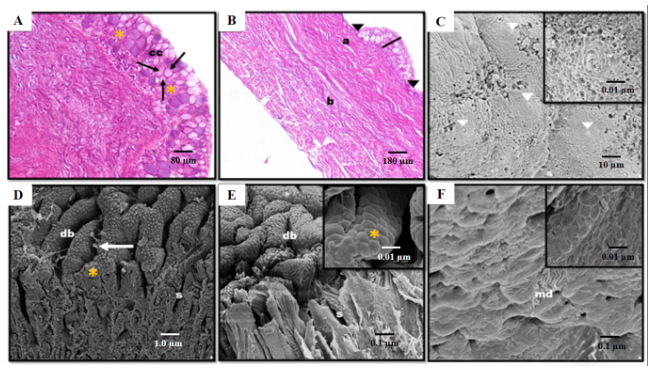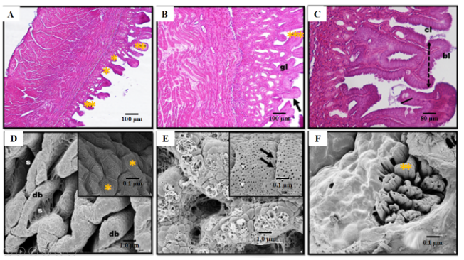 The ultramicroscopic scanning study of the surface of the paiche’s stomach mucosa presented it is formed of numerous folds and interdigitations (D). These are overlaid by cuboid epithelial cells (E) with micro-orifices (arrowhead) on the surface of the plasma membrane of these cells.
