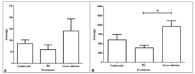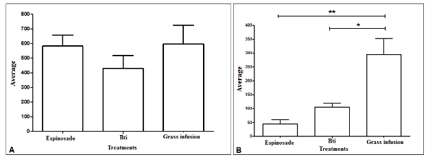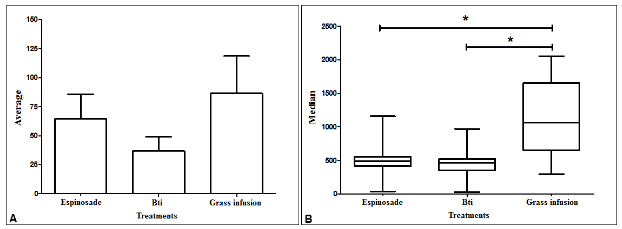 Regarding A. albopictus oviposition, 147.75 average eggs were obtained in the four replications. The highest average of eggs was obtained for the grass infusion (294), with a value about seven times higher than spinosad (43.5) and about three times higher compared to Bti (105.75).