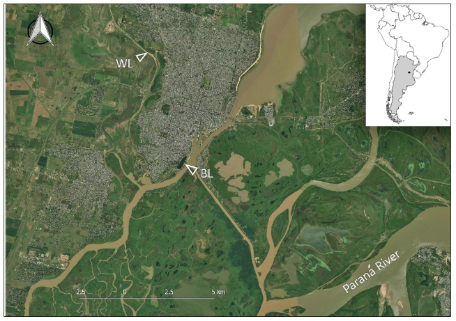 Sampling was carried out in two lentic environments in the municipality of Santa Fe, Argentina: the lagoon located in General Manuel Belgrano Park – BL (31º39´ S, 60º42´ W) has a surface area of 12 hectares and an average depth of 2.7 meters, and a lagoon in the Western Urban Nature Reserve – WL (31°36´ S, 60°43´ W), with an average of 0.40 meters deep. Neither environment presents a surface connection with nearby channels of the alluvial plain of the Paraná River (Figure 1).