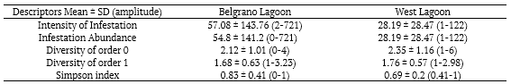 In WL, 100% fish were parasitized, while the prevalence in BL was 96%. The parasite descriptors and the attributes of the communities associated with the hosts of each lagoon are listed in Table 1.