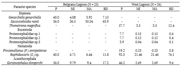 A total of 2,103 endoparasites were found, 1,370 in BL fish and 733 in WL fish. In BL fish, 4 metazoan taxa were found: Genarchella genarchella Travassos, Artigas & Pereira, 1928 (metacercariae); Saccocoelioides nanii Szidat, 1954; Raphidascaris (Sprentascaris) sp. Petter & Cassone, 1984 and Gorytocephalus elongorchi Thatcher, 1979. In WL specimens, 7 taxa were found: Thometrema magnifica, Szidat, 1954; three morphospecies of Proteocephalidae La Rue, 1911 (sp.1, sp.2, and sp.3); Raphidascaris (Sprentascaris) sp.; Procamallanus (Procamallanus) annipetterae Kohn & Fernandes, 1988 and G. elongorchi.