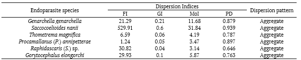 The dispersion pattern of all helminths was aggregated (Table 3).