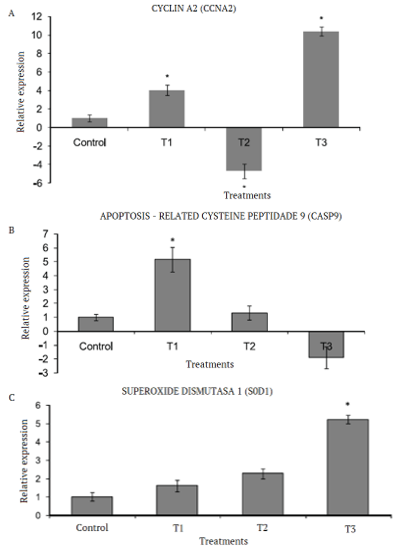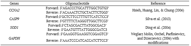 Quantitative PCR measurement reactions were performed using Platinum® SYBR Green qPCR Supermix-UDG (Invitrogen). The total volume for each primer tested with different cDNAs was 20 µL. Reactions were performed in PTC 200 DNA Engine Cycler using a Chromo4 Detection System (MJ Research). Data were normalized with reference gene glyceraldehyde 3-phosphate dehydrogenase (GAPDH), considering an efficiency above 80%, in each cDNA amplified in PCR-RT experiments. The reference gene was selected according to the stability of gene expression among groups. The relative expression was calculated (Pfaffl, Horgan, & Dempfle, 2002). Oligonucleotides used were SOD-1 (Superoxide dismutase 1), CCNA2 (Cyclin A2), CASP9 (Apoptosis-related cysteine peptidase 9) and GAPDH (Glyceraldehyde-3-phosphate dehydrogenase) (Table 1). The expression of target genes was compared to that of the reference gene, GAPDH.
