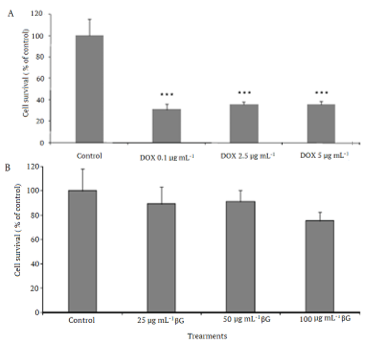 The cytotoxic effect of βG and Dox on the MCF-7 cell line was determined by the 3 - [4,5-dimethylthiazol-2-yl] -2,5-diphenyltetrazolium bromide assay (MTT), according to the protocol described by Mosmann (1983) with modifications. Briefly, cells were seeded on 96-well plates at a concentration of 2.5x 104 cells/well in 100 µl DMEM medium (Gibco), and pre-incubated at 37°C and 5% CO2 for 24 hours. Then, supernatant was removed and replaced with fresh medium without FBS containing βG (25, 50 and 100 mg mL-1) or Dox (0.1; 2.5; and 5mg mL-1). After 24 hours of exposure, 150 μl MTT solution (0.5 mg mL-1) were added to each well and kept at 37°C for 4 hours. The MTT solution was carefully discarded and formazan crystals were dissolved with 200 µL DMSO. Absorbance was measured at 550 nm using a spectrophotometer (Uniscience). Data were evaluated as relative cell survival rate (%) = (Absorbance Test/Absorbance control) ×100. MTT assay was performed in three experiments.