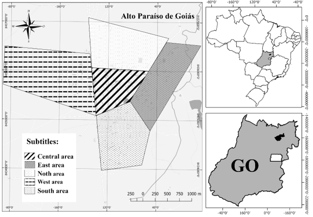 Alto Paraíso de Goiás has an area of 2,593,905 km² and a demographic density of 2.65 cit/km2. Only 45.8% of the residences have sewers and sanitary installations; 91.9% of the public streets are tree lined and 4.4% are urbanized (IBGE, 2017). The main economic activities of the region are ecotourism and agriculture. The city has a large number of small inns and houses for season renting, with large yards and some type of vegetation. There is an important mystical culture and vocation for anthropic activities such as agricultural expansion, mineral mining, native plant extraction, hunting and uncontrolled tourism besides the introduction of exotic species.
