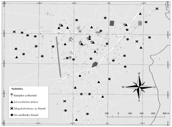 The geographical coordinates of the houses visited were marked with GPS (Garmin Etrex 30). The points were used to differentiate: a) places where the interviewees reported having found the giant African snail; b) places where the interviewees reported Megalobulimus sp; c) places where none of the snails have ever appeared. There was also a superficial search for individuals of the species in the houses visited. The collected mollusks (live individuals and empty shells) were counted, marked and packed in 70% ethanol. The samples were taken to the Bentos Laboratory in Brasília, for the disposal of the UnB Mollusk Collection.