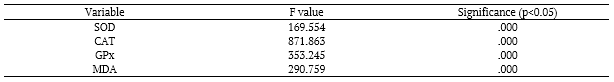 One-way ANOVA results indicated that there was a very significant difference of antioxidant effect between all treatment groups in all tested parameters (Table 1).