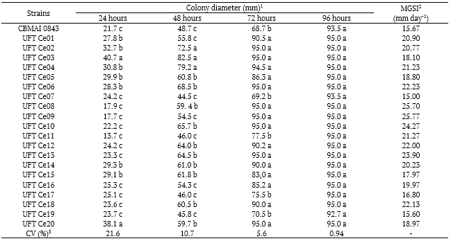 The reference strain had the third lowest MGSI (15.67 mm day-1), ahead of only the isolates UFT-Ce07 (15.0 mm day-1) and UFT-Ce19 (15.60 mm day-1), thus indicating that out of the 20 isolates, 18 showed grown better than the reference strain. In the 24-hour period, the UFT-Ce03 and UFT-Ce20 isolates statistically differed the most showing the highest growth. As for the 48 hours period, the isolates with the most statistically significant growth were UFT-Ce02, UFT-Ce03, and UFT-Ce04. Within 72 hours, some strains had already filled the dish diameter (95 mm), thus generating a more uniform growth profile.