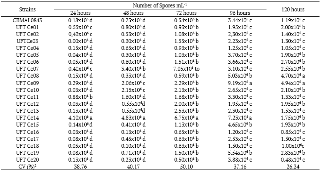 As for the number of spores, the UFT-Ce09 and UFT-Ce14 isolates had the highest number of spores in the 96 hours period, with 9.19 x 106 spores mL-1 and 7.23 x 106 spores mL- 1, respectively, statistically differing from the other isolates assessed. In the 72 hours period, the UFT-Ce07 isolate showed greater sporulation, with 7.05 x 106 spores mL-1 (Table 2). Most isolates of Cunninghamella spp. had a behavior similar to the reference strain C. elegans (CBMAI 0843) regarding the period of greatest sporulation and number of spores.