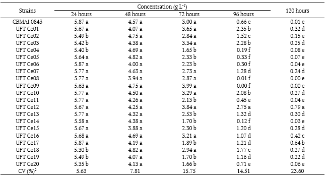 In the final assessment, 120 hours, in addition to the UFT-Ce04, UFT-Ce05, UFT-Ce06, UFT-Ce08, UFT-Ce09 and UFT-Ce14 isolates, the reference strain (CBMAI 0843) and the UFT-Ce02, UFT-Ce11 and UFT-Ce20 isolates showed lower residual glucose amounts in the culture medium (Table 3). From 20 g L-1 of glucose added in liquid YPD medium, an average of 0.21 g L-1 remained, compared to the isolates that did not consume all glucose in the end of the fermentation process, thus suggesting no excess carbon source in the culture medium for fungi growth.