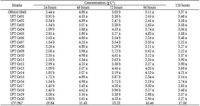 We found that for most of the assessed isolates, the period of greatest growth occurred within 48 hours of cultivation, and in this period, the UFT-Ce08 isolate had the highest amount of biomass, 20.17 g L-1, followed by UFT-Ce20 isolate, with 12.64 gL-1, the reference strain CBMAI 0843, with 10.78 g L-1, UFT-Ce11, with 10.72 g L-1, UFT-Ce02, with 9.42 g. L-1, UFT-Ce09, with 9.34 g L-1, and the UFT-Ce05 isolate, with lower biomass, 9.15 g L-1 (Table 6). The UFT-Ce04 and UFT-Ce14 isolates showed greater growth in the period of 72 hours, with 13.26 g L-1 and 10.50 g L-1, respectively. The UFT-Ce06 isolate, in contrast, had greater growth in 96 hours, with 11.17 g L-1 of dry biomass (Table 6).